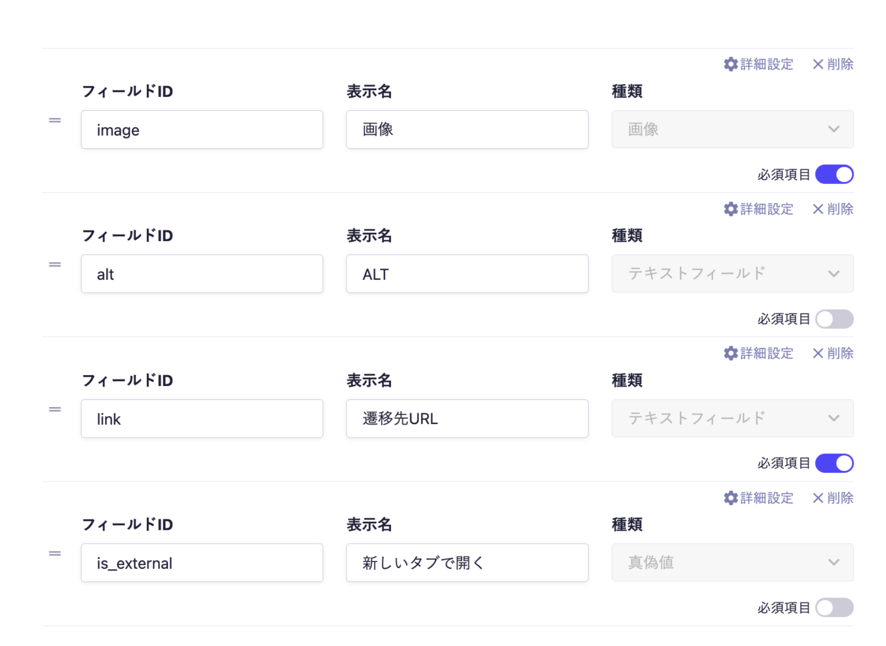 microCMSには以下の入力欄がある