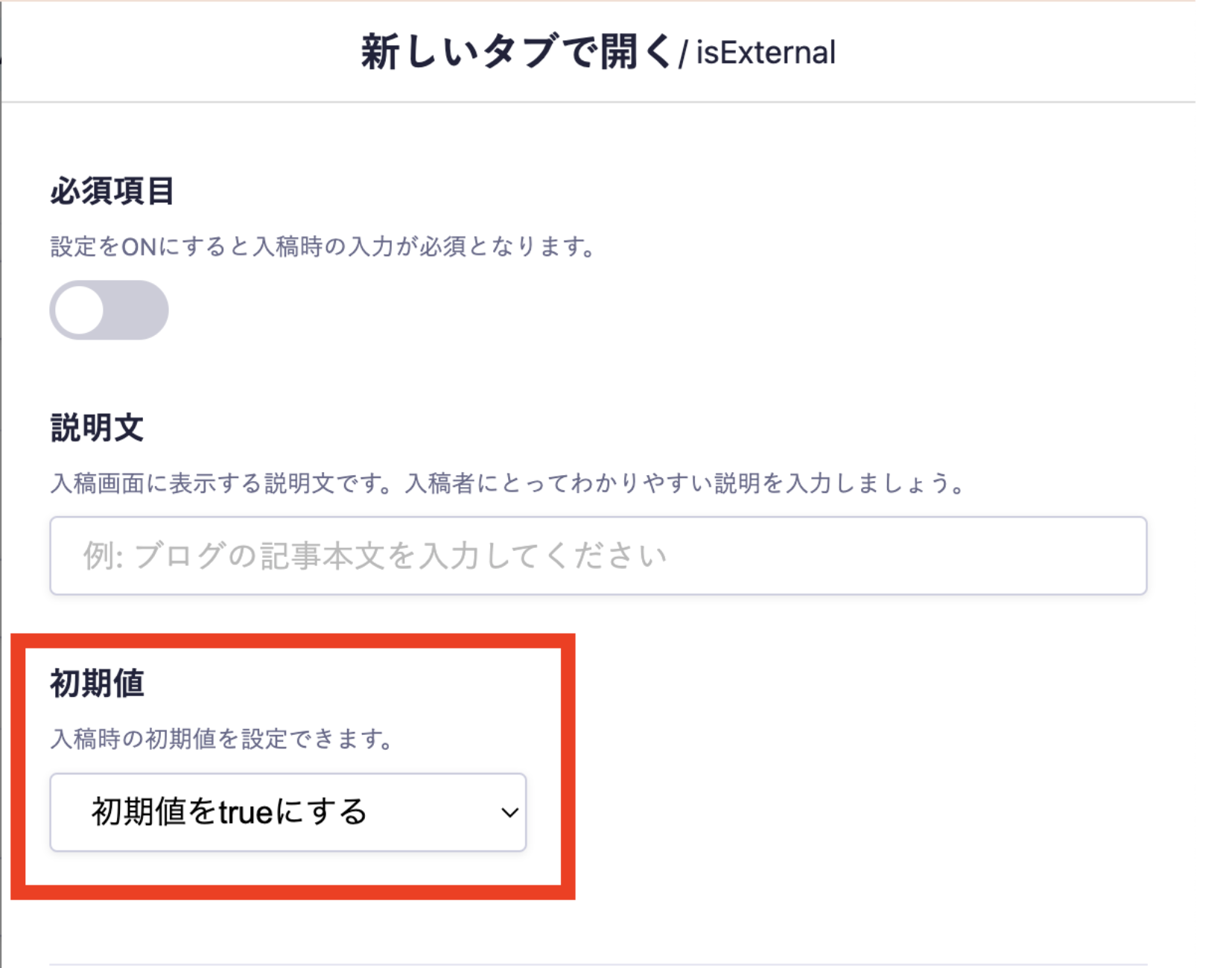 is_externalの詳細設定から初期値が設定できるので、初期値をtrueにしてデフォルトで新しいタブで開くようにしました。