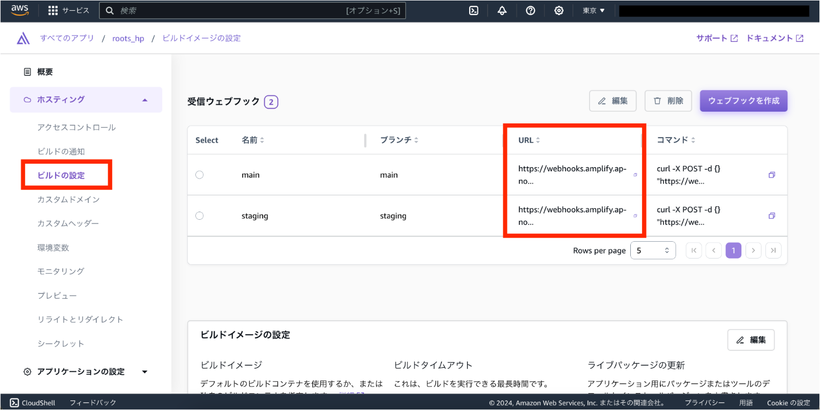 AWS Amplifyのビルド設定から本番環境(main)とステージング環境(staging)のWebhookをそれぞれコピーします。