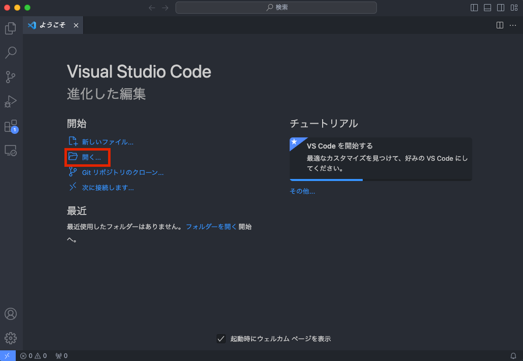 そして、VSCodeを起動し、「開く...」から先ほど作成したプロジェクトディレクトリを選択します。