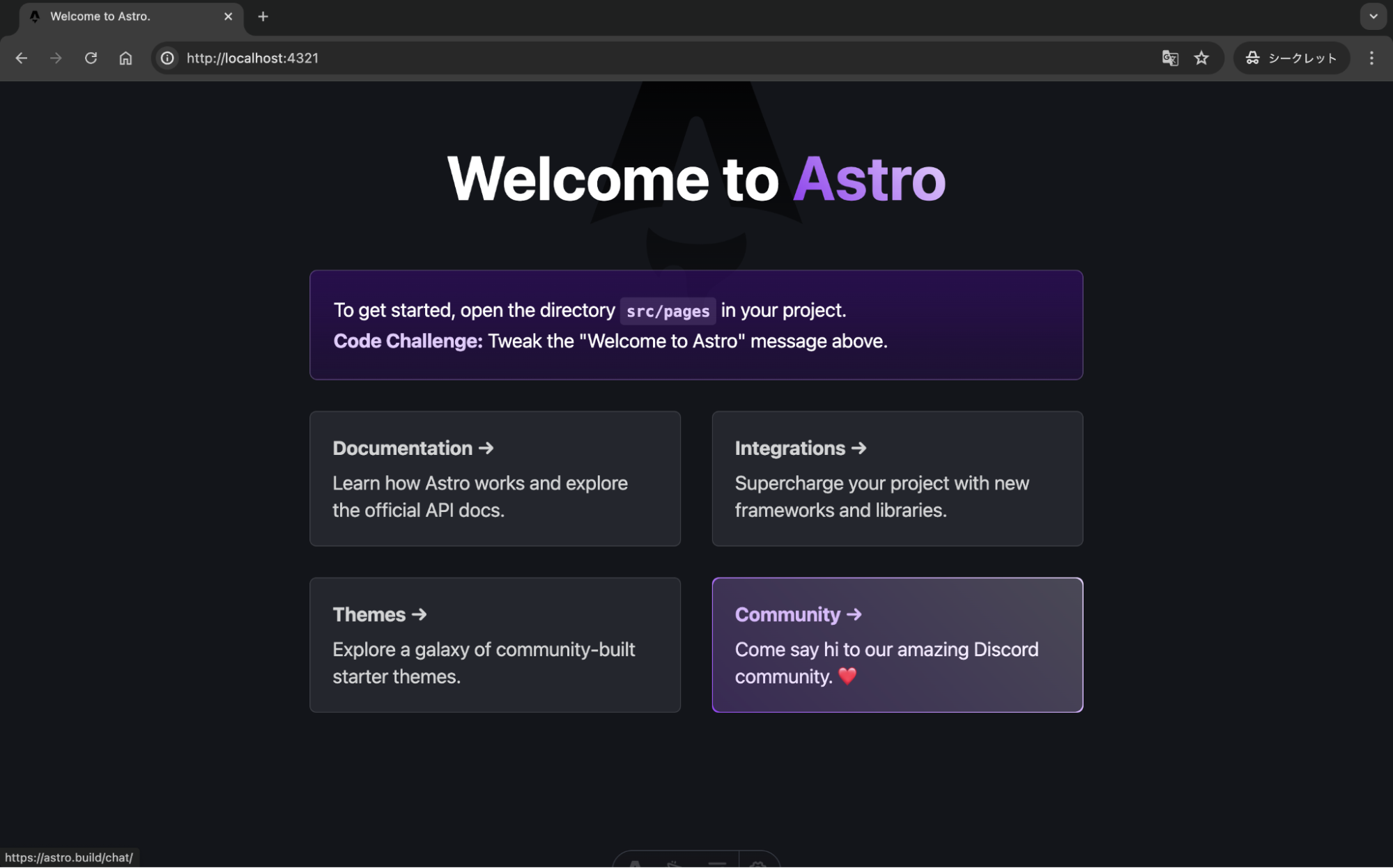 npm run dev4. ブラウザでAstroのウェルカムページが開いたら成功です