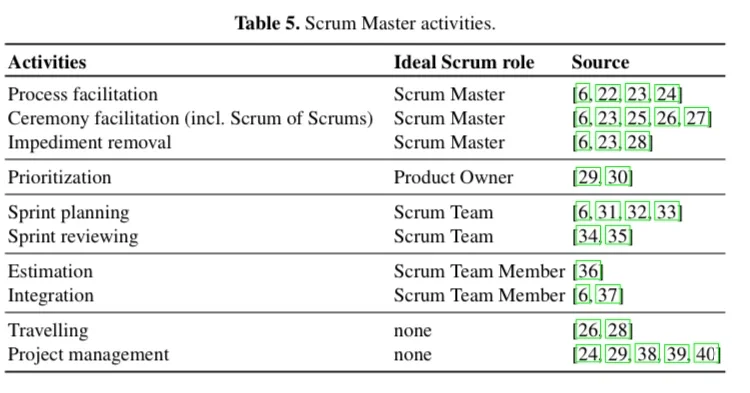 We found nine activities that are performed by Scrum Masters. In addition, we found that Scrum Masters also perform other roles, most importantly as Project Managers. This latter situation results in tension and conflict of interest that could have a negative impact on the performance of the team as a whole.