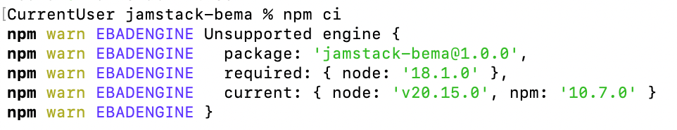 }これで、バージョンの違うNode.jsを使用している場合にnpmコマンドを実行すると警告が出るようになります。