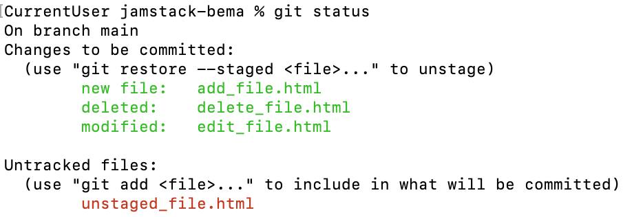 git statusこのコマンドを実行することで次のステータスが確認できます