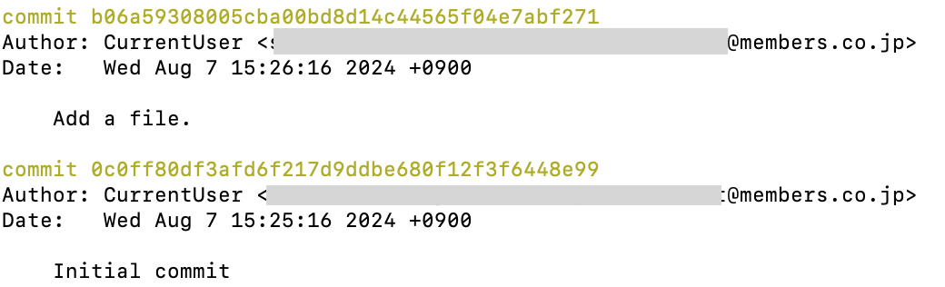 コミットの履歴を確認したい場合は、以下のコマンドを実行すると履歴を確認することができます。