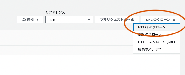 CodeCommit上で、作成したリポジトリの詳細画面に行き、URLのクローンから「HTTPSのクローン」を選択してリモートリポジトリのURLをコピーします。