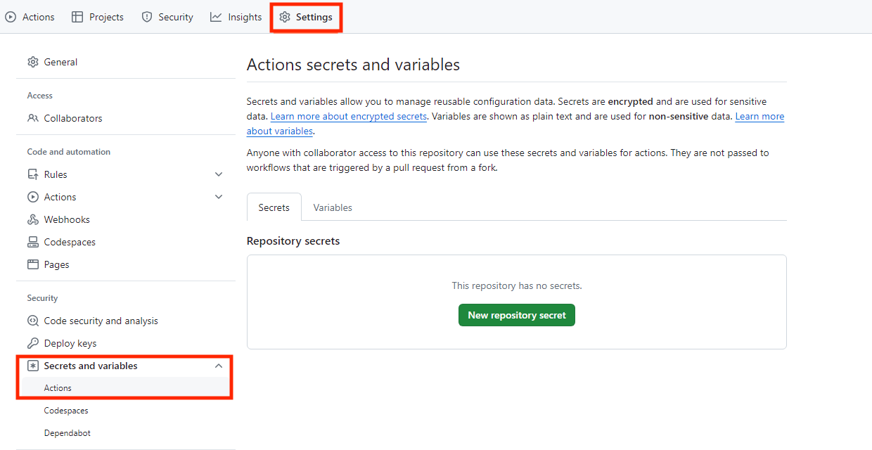 通知を行いたいリポジトリの「Settings」を選択、メニューの「Secrets and variables」から「Actions」を選択