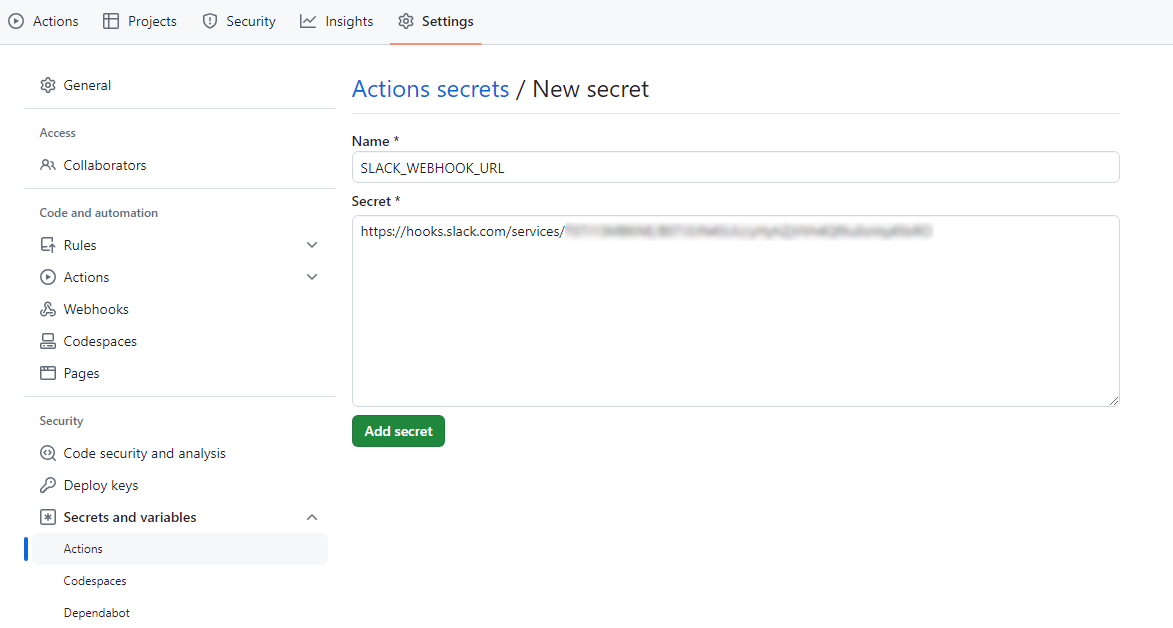 「SLACK_WEBHOOK」には Webhook URLを割り当てるため、先ほどGitHubに登録したsecretを設定します。