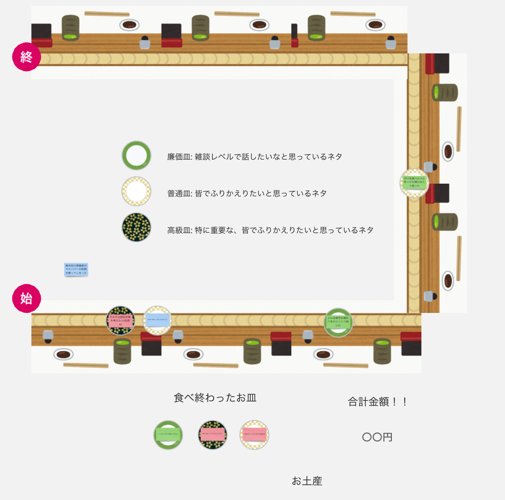 回転寿司レトロスペクティブは、焼肉レトロスペクティブの基本的な流れを抑えつつ、回転寿司の要素を加えたふりかえり手法です。