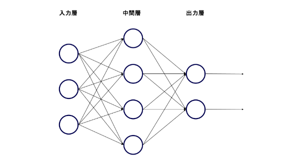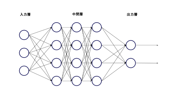 ノードを繋ぎ合わせて入力層・中間層(隠れ層)・出力層からなるモデルのことです。