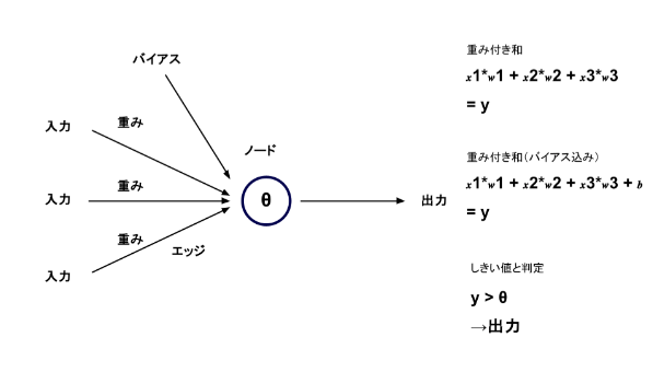 複数の入力とバイアス、活性化関数・しきい値を元に1つの出力をします。もう少し詳しく説明をすると入力(x)には重み(ニューロンとニューロンの繋がりの強さ、ω)がかけられます。入力と重みの積にバイアスを足し合わせた総和を活性化関数で処理し、出力値を決定します。そして、出力値がしきい値を超える場合に値が出力されます。