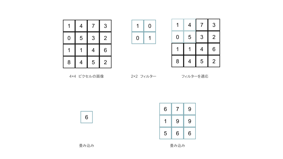 畳み込みでは画像を特徴量で絞り込み、どんどん小さくしていきます。例えば下の図のように4×4ピクセルの画像があります。2×2のフィルターを用意しデータの値を計算します。