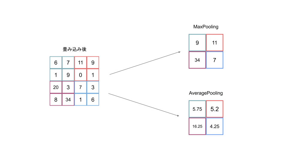 プーリングにはMaxPoolingとAveragePoolingの2種類があります。畳み込み層で処理を終えた画像にMaxPoolingでは決めた範囲の最大値を、AveragePoolingでは決められた範囲の平均値を取り出して圧縮します。下の図は2×2のPoolingの際の処理の例です。枠の色をみていただけるとわかりやすいと思います。