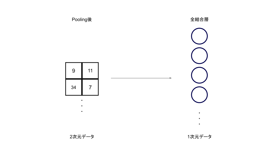 何回か畳み込みとプーリングを行い、最後に2次元の特徴を全て1次元の特徴に直し、全てのノードを繋ぎ合わせるのが全結合層です。CNNの出力層は全結合層になります。