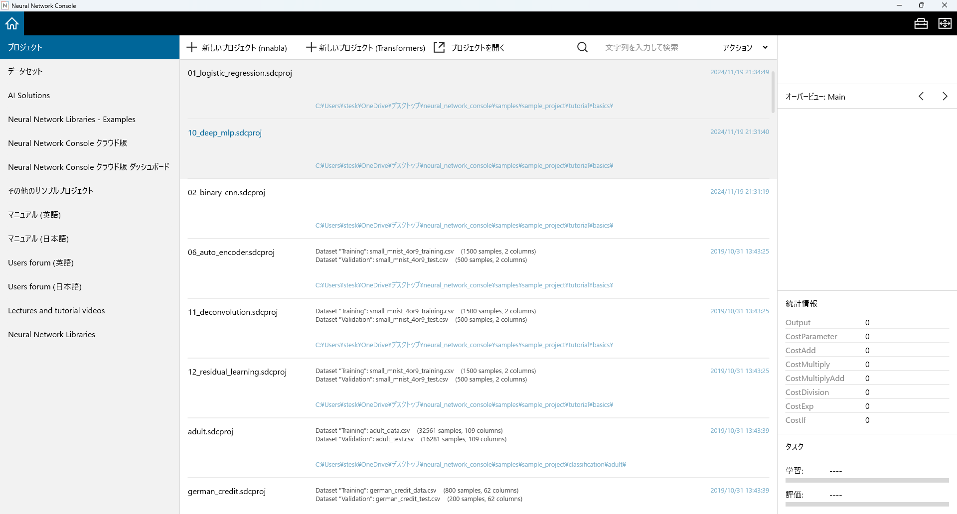 大体使い方がわかる方は、新しいプロジェクト(nnabla/Transformers)をクリックします。こちらはフレームワークの違いなのでお好きな方を選んでください。(nnablaはSONYが開発したフレームワークです。)※この場合は自身でデータセットの設定をすることが必要になります。