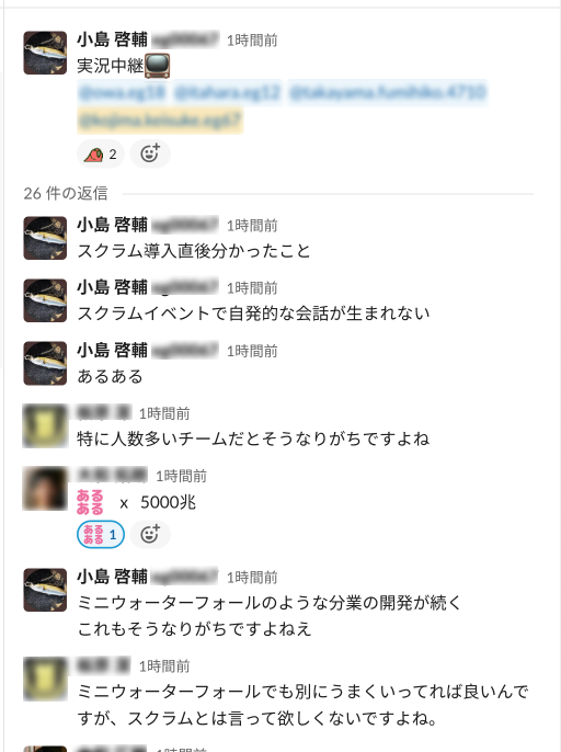 Youtubeにあがっているスクラムフェスの登壇動画を一緒にみながらslackで感想や疑問をシェアしたり、視聴後に内容についてディスカッションする..