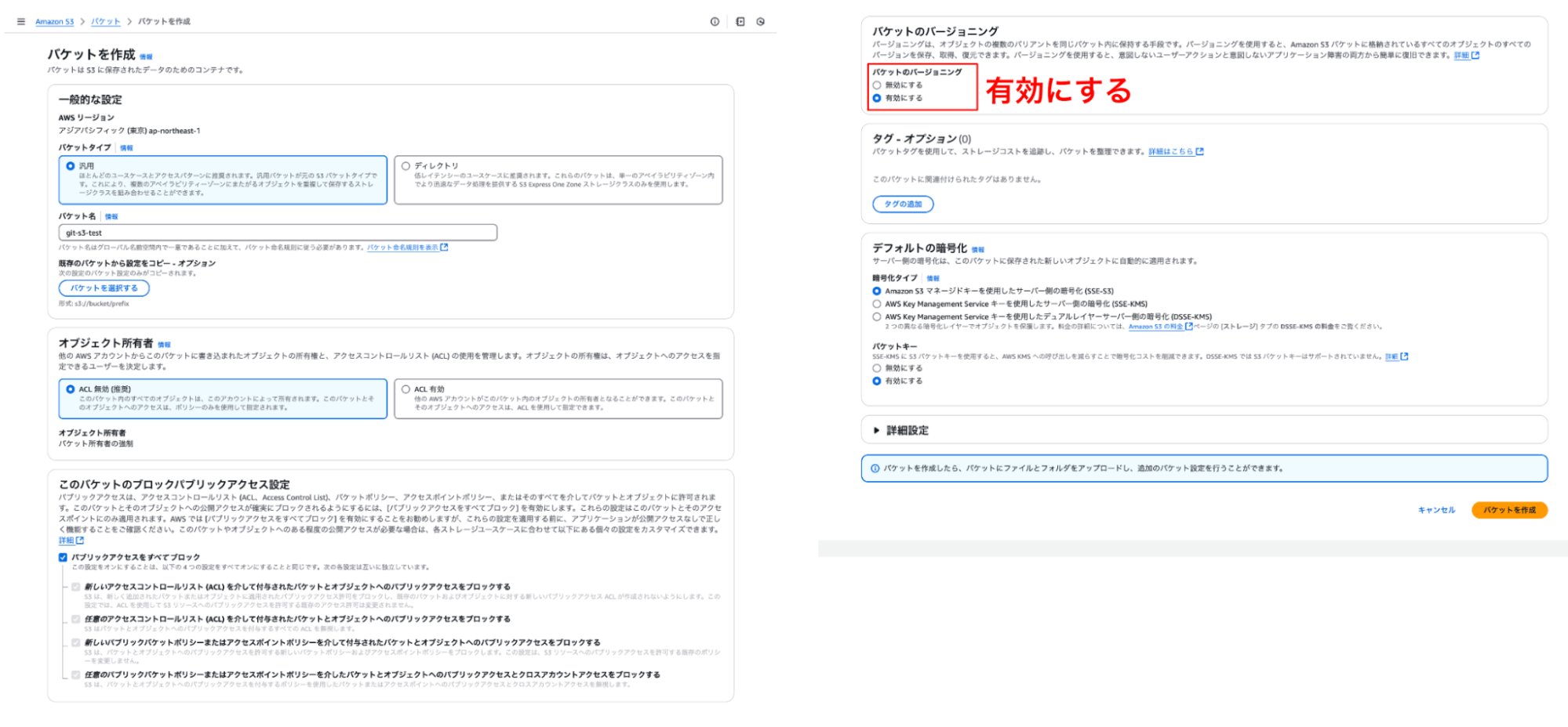 S3作成する際は、後ほどCodePipelineで読み込むため、バケットのバージョニング設定を有効にする必要があります。