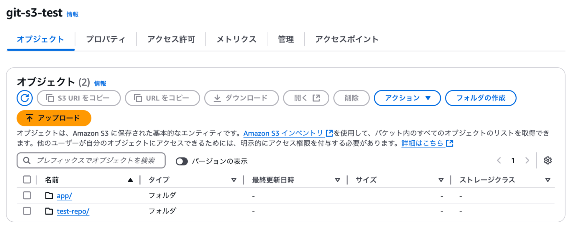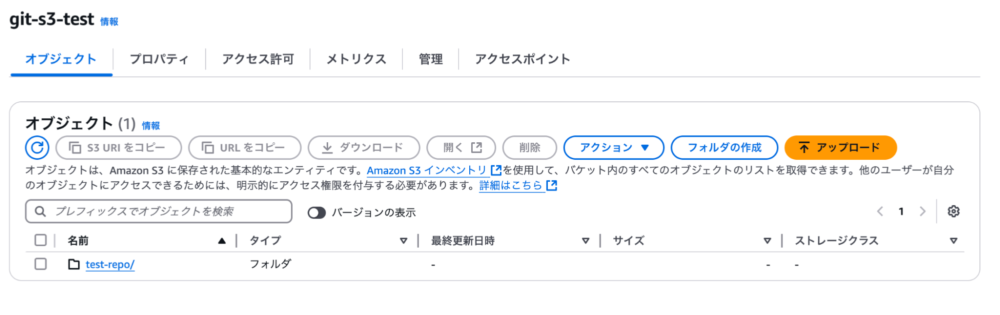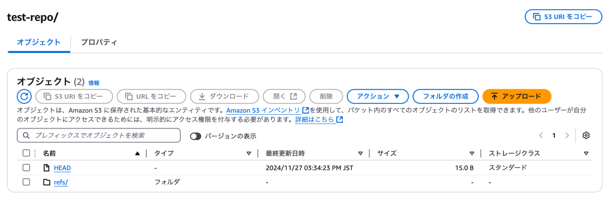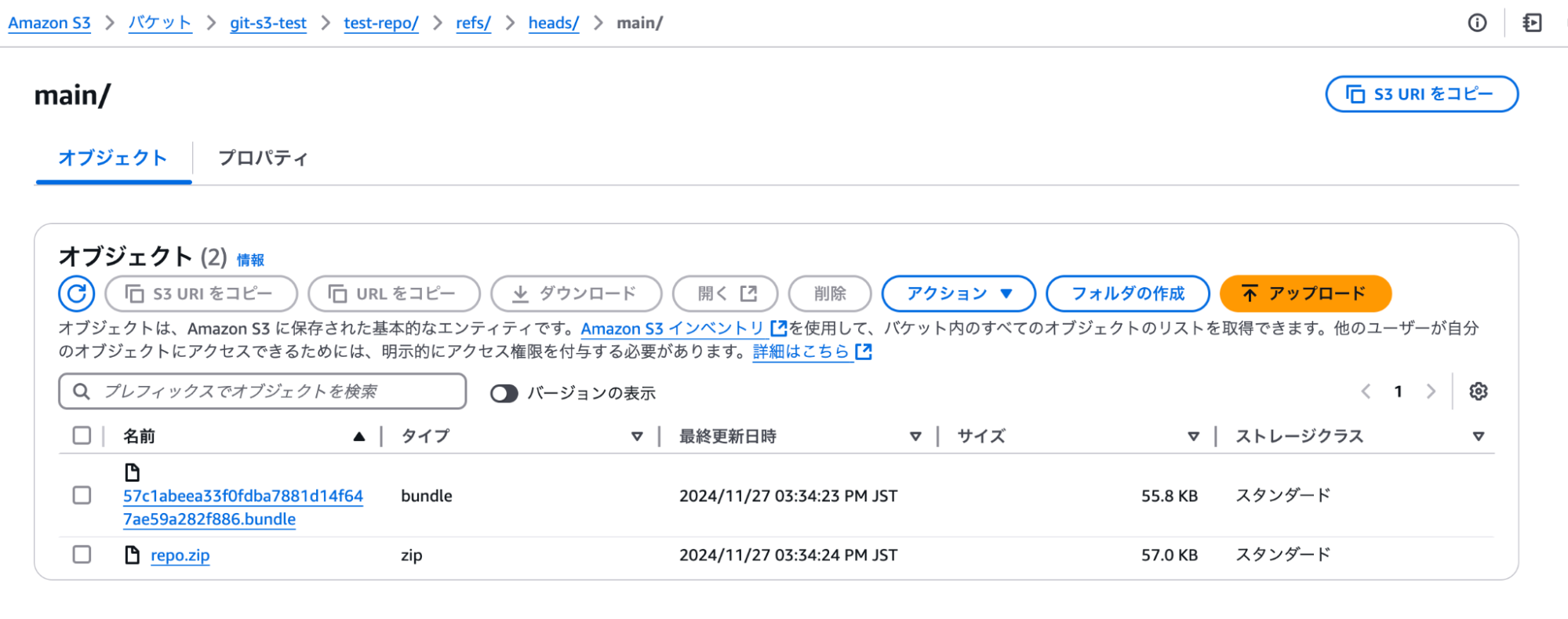 git remote add origin s3+zip://git-s3-test/test-repo後は通常通り、コミットしてプッシュします。