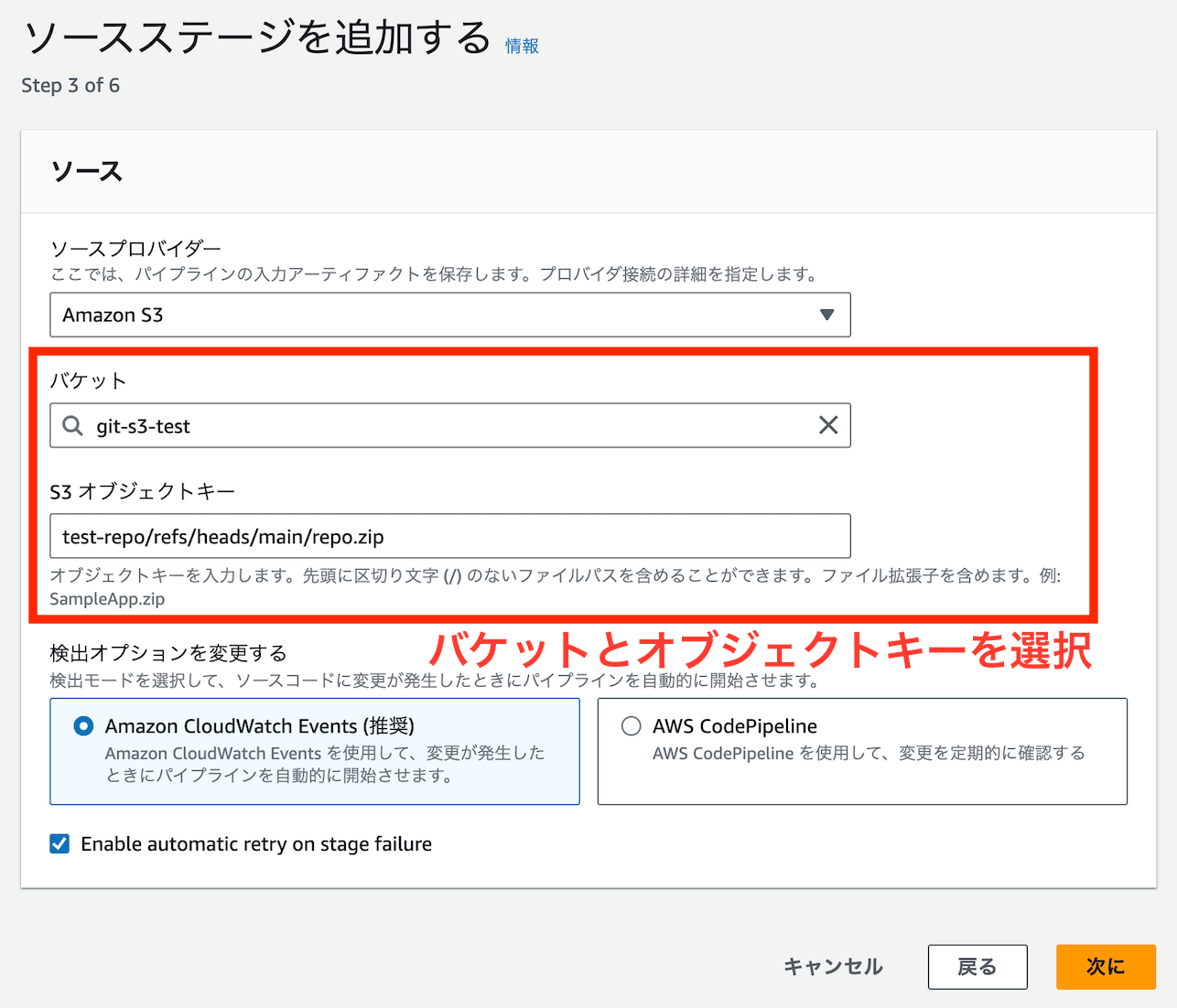 このrepo.zipをCodePipelineの監視対象にすることでプッシュを検知できます。