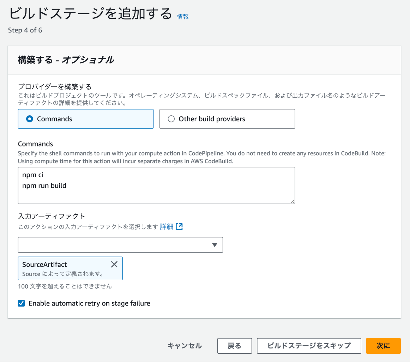 ビルドコマンドには、npm ciとnpm run buildを設定します。また、ここでは設定しきれない内容もあるため、後ほどビルド処理は追加で設定を行います。