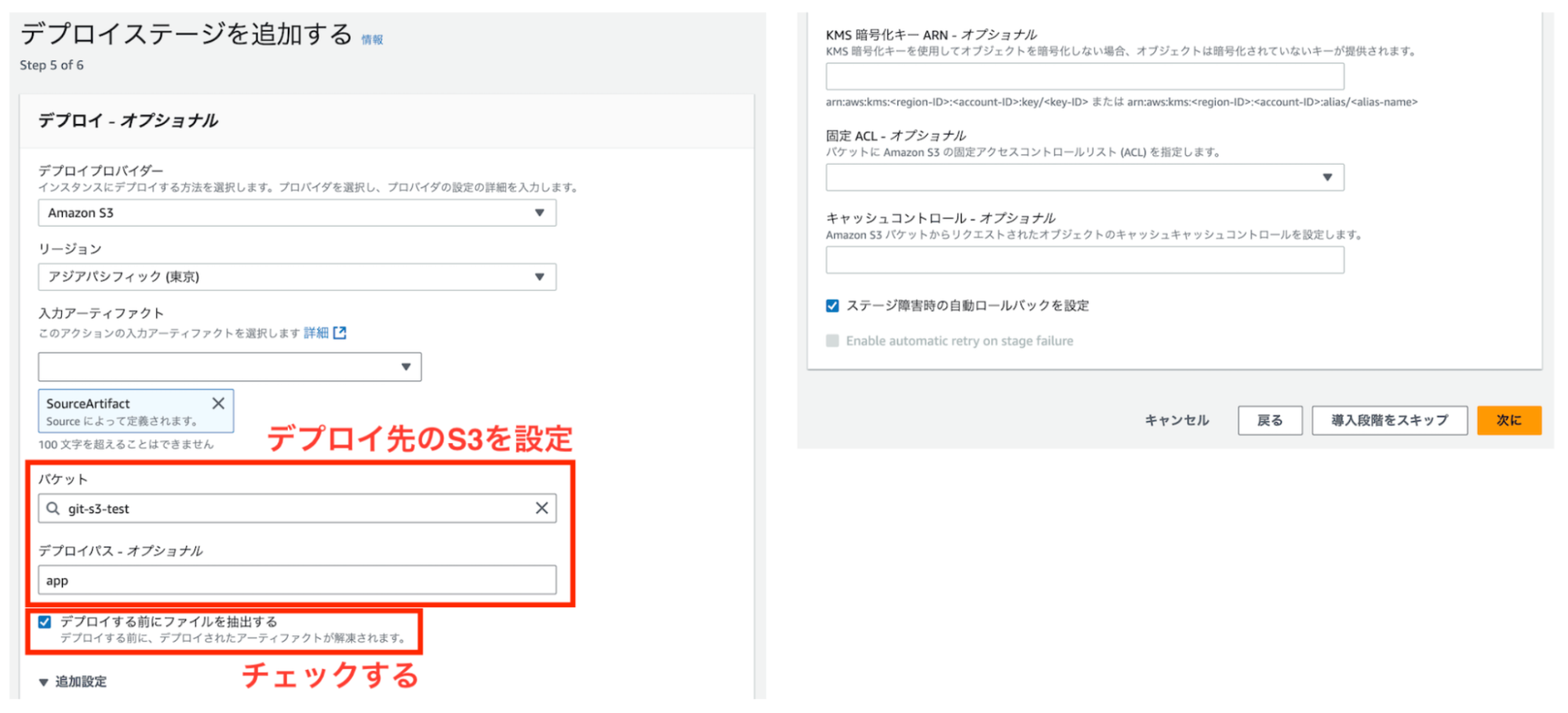 デプロイ先のS3を設定し、「デプロイする前にファイルを抽出する」にチェックを入れます。