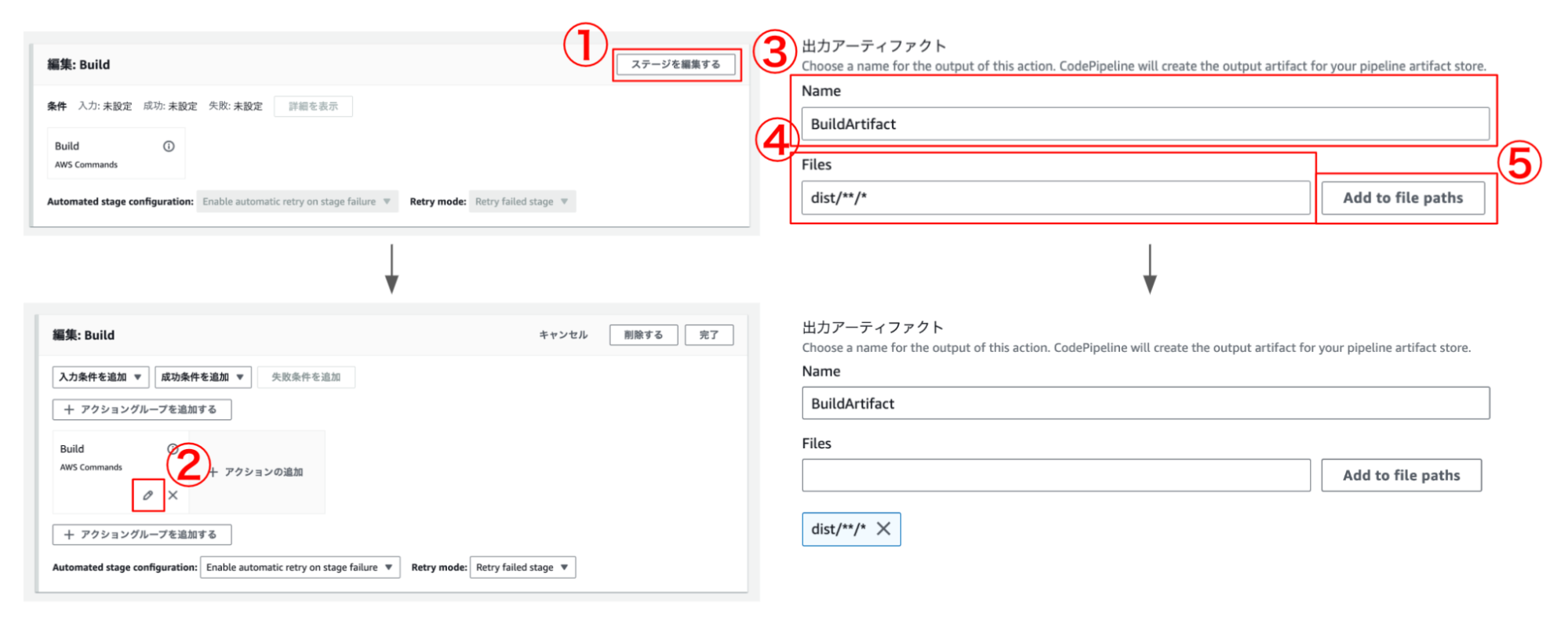 出力アーティファクトに「BuildArtifact」を設定し、FilesにAstroでビルドファイルが保存されるディレクトリ配下「dist/**/*」を指定して、「Add to file paths」を押します。