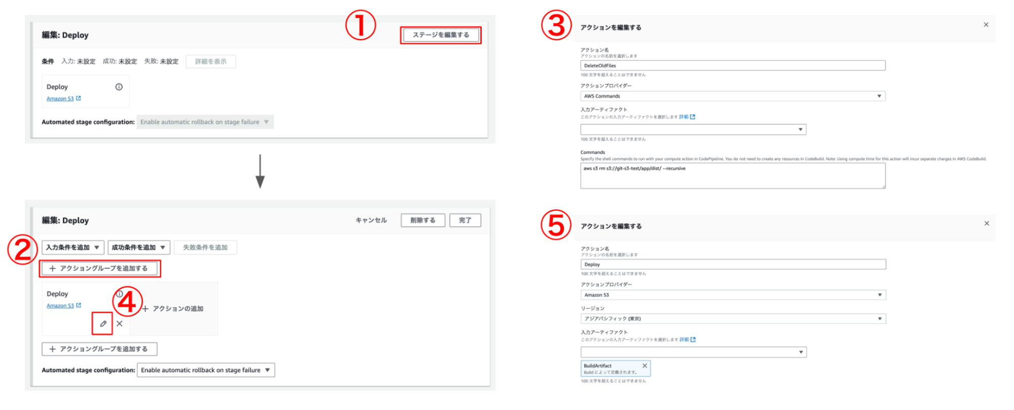 アクショングループを追加して、デプロイ前にS3の古いデプロイファイルを削除する処理を追加します。