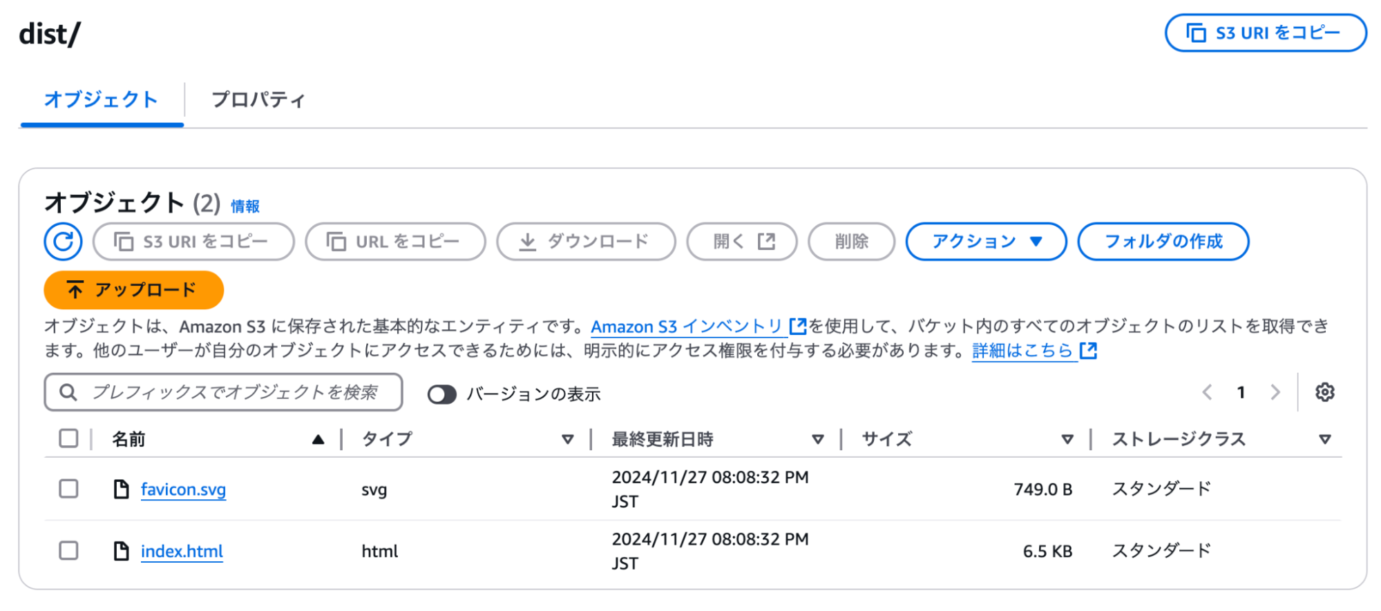 無事ビルドが完了すると、S3にappフォルダが作成されており、中にビルドファイルが格納されています。