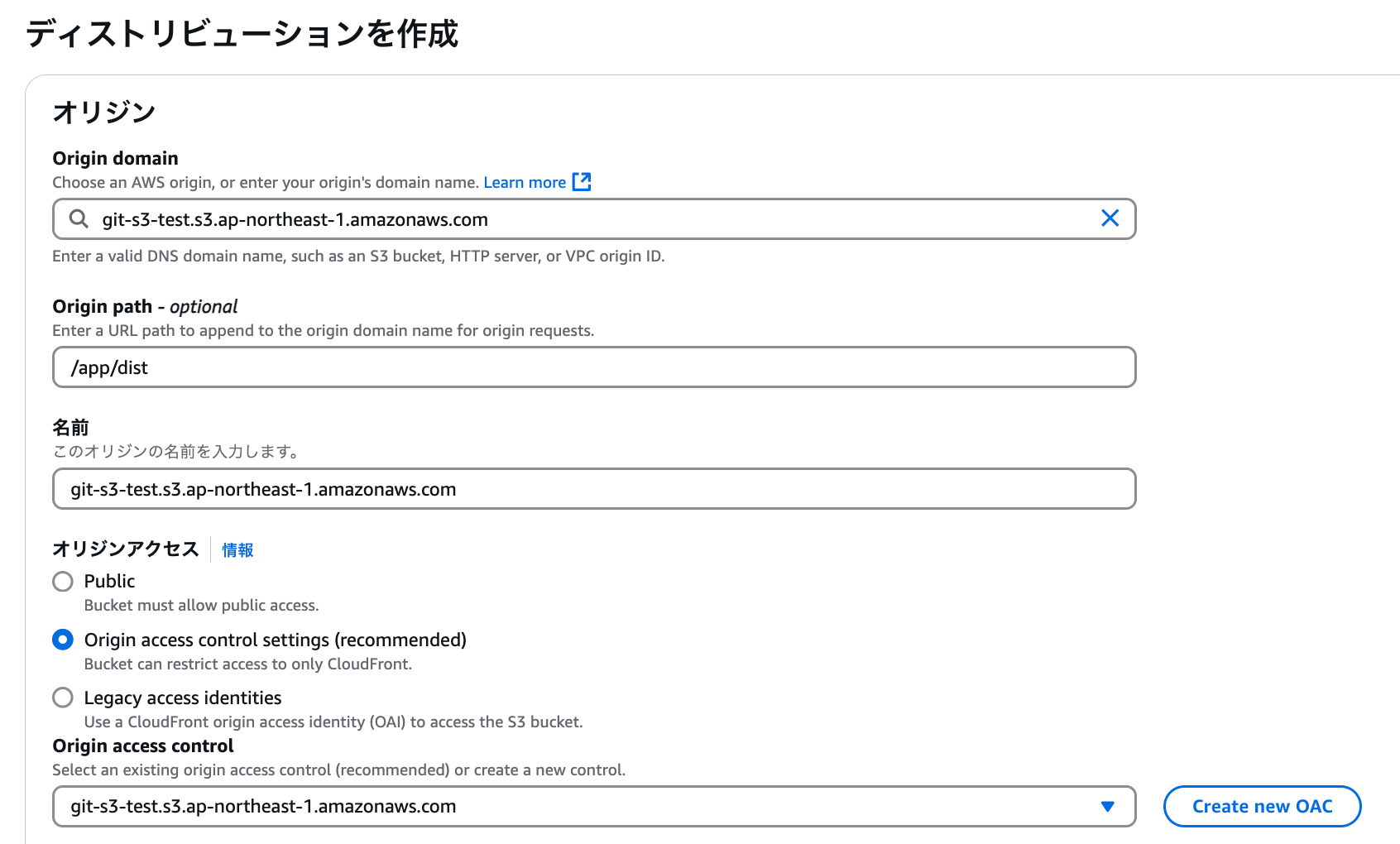 オリジンアクセスで「Origin access control settings (recommended)」を選択して「Origin access control」にデプロイ先のS3を設定