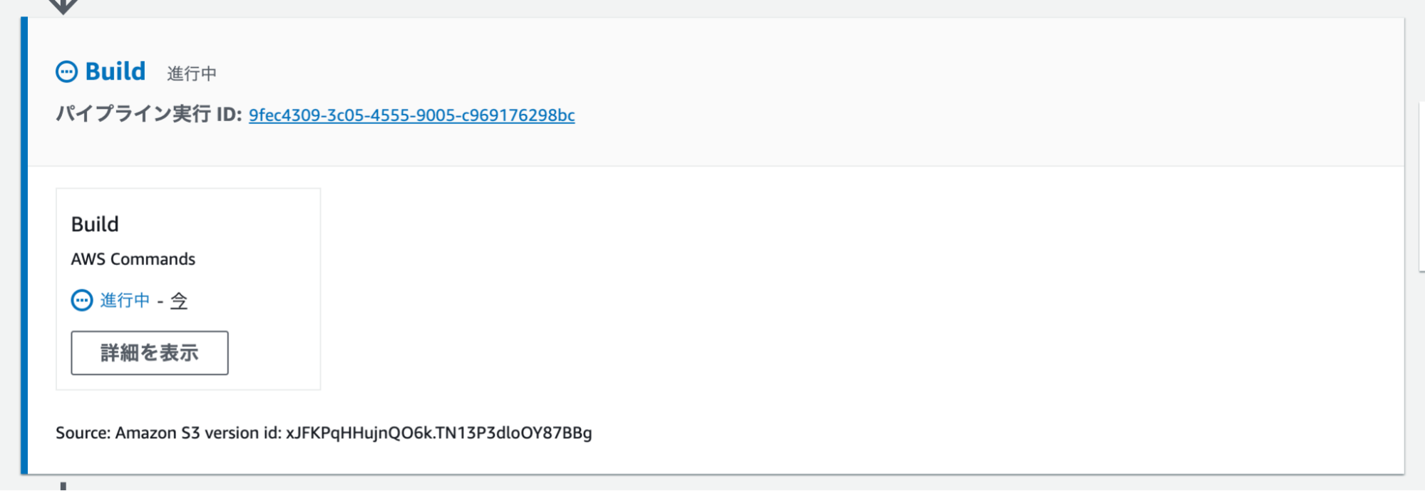 S3への変更を検知して、CodePipelineのビルドが走り始めました。