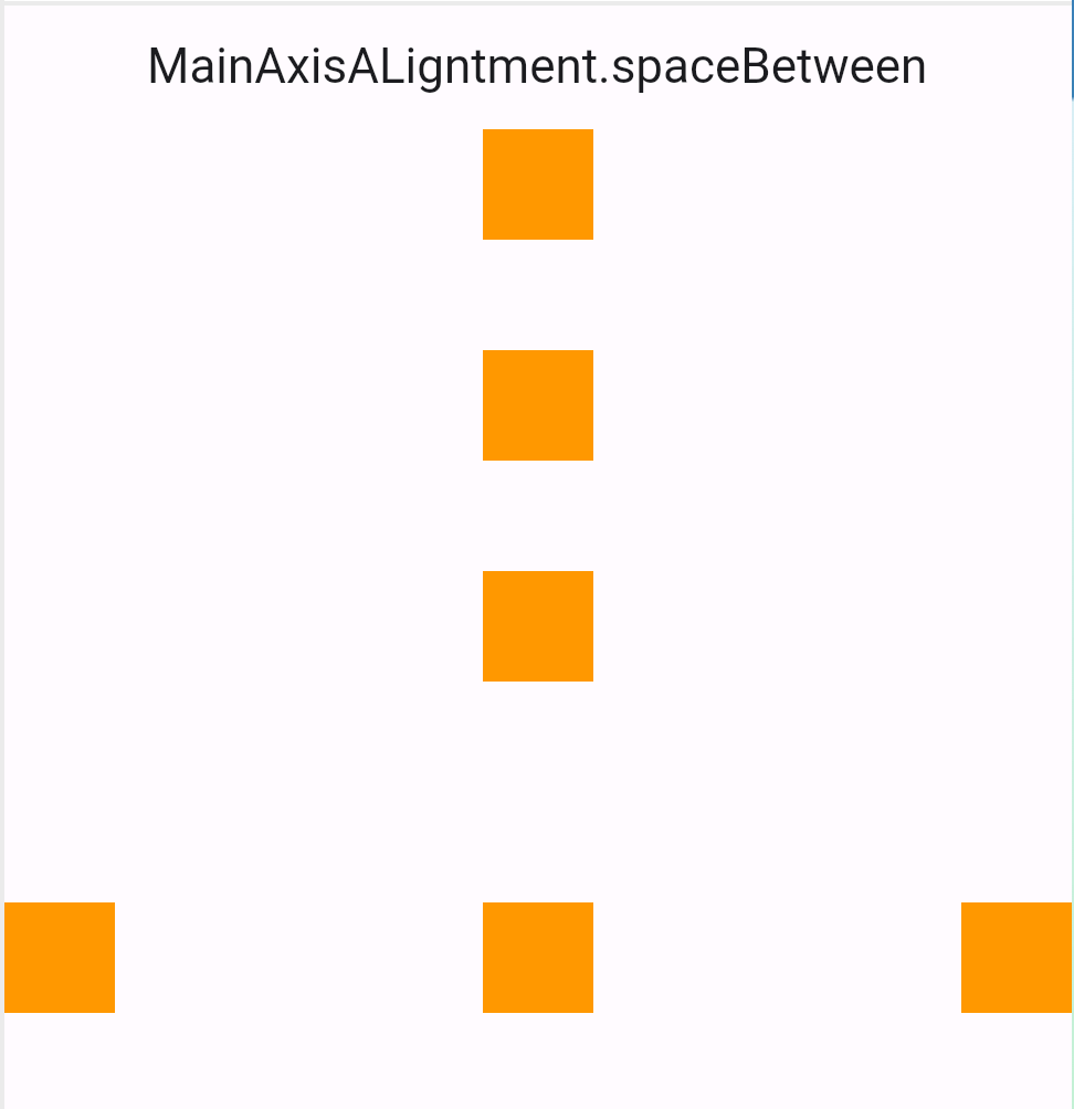 spaceBetween | 先頭と末尾の子Widget 以外、子Widgetの間に 均等なスペースを空ける | 先頭と末尾の子Widget 以外、子Widgetの間に 均等なスペースを空ける | |