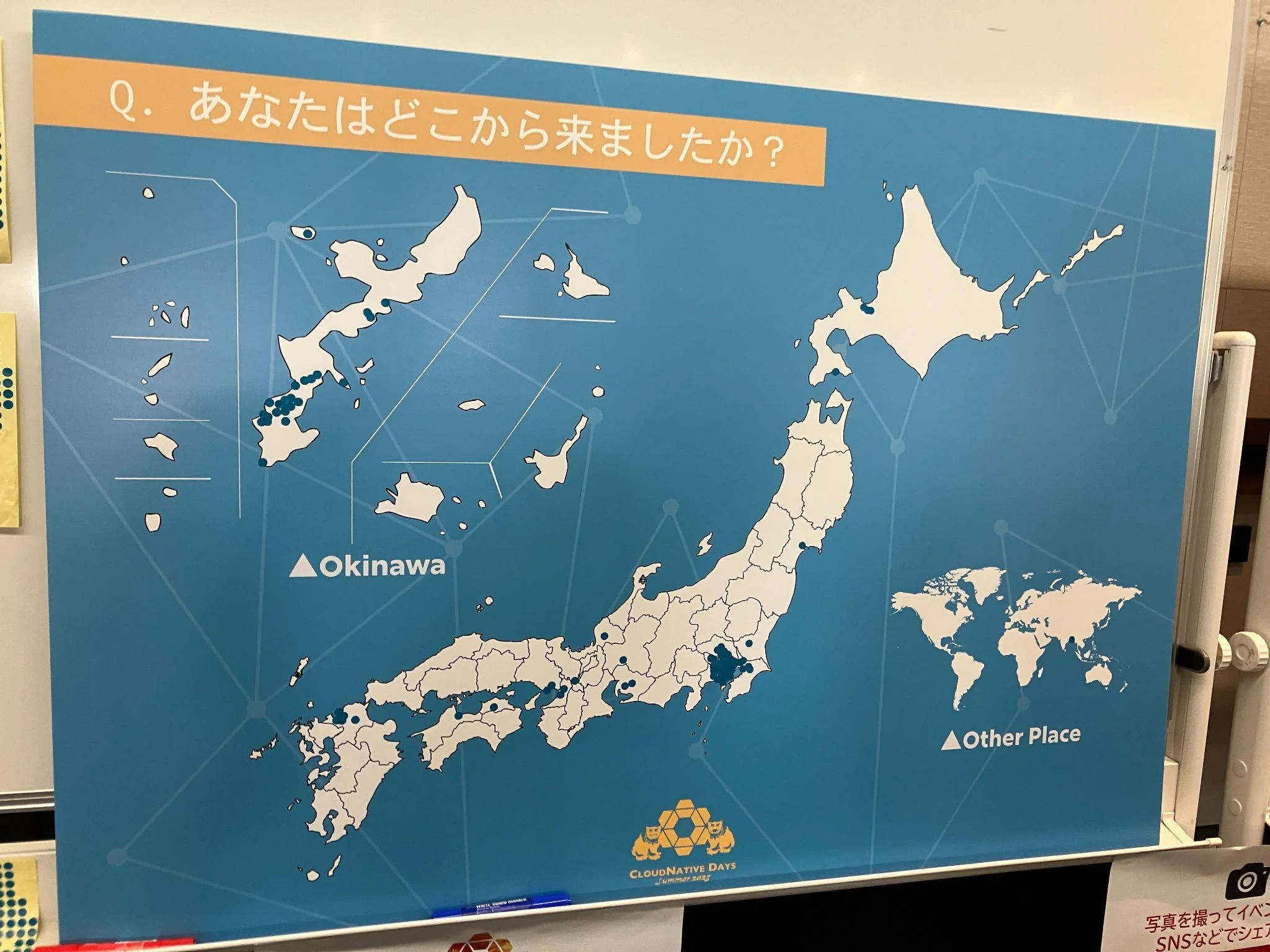 どこから参加したかをシールで著したボード、国外からの参加者もいました