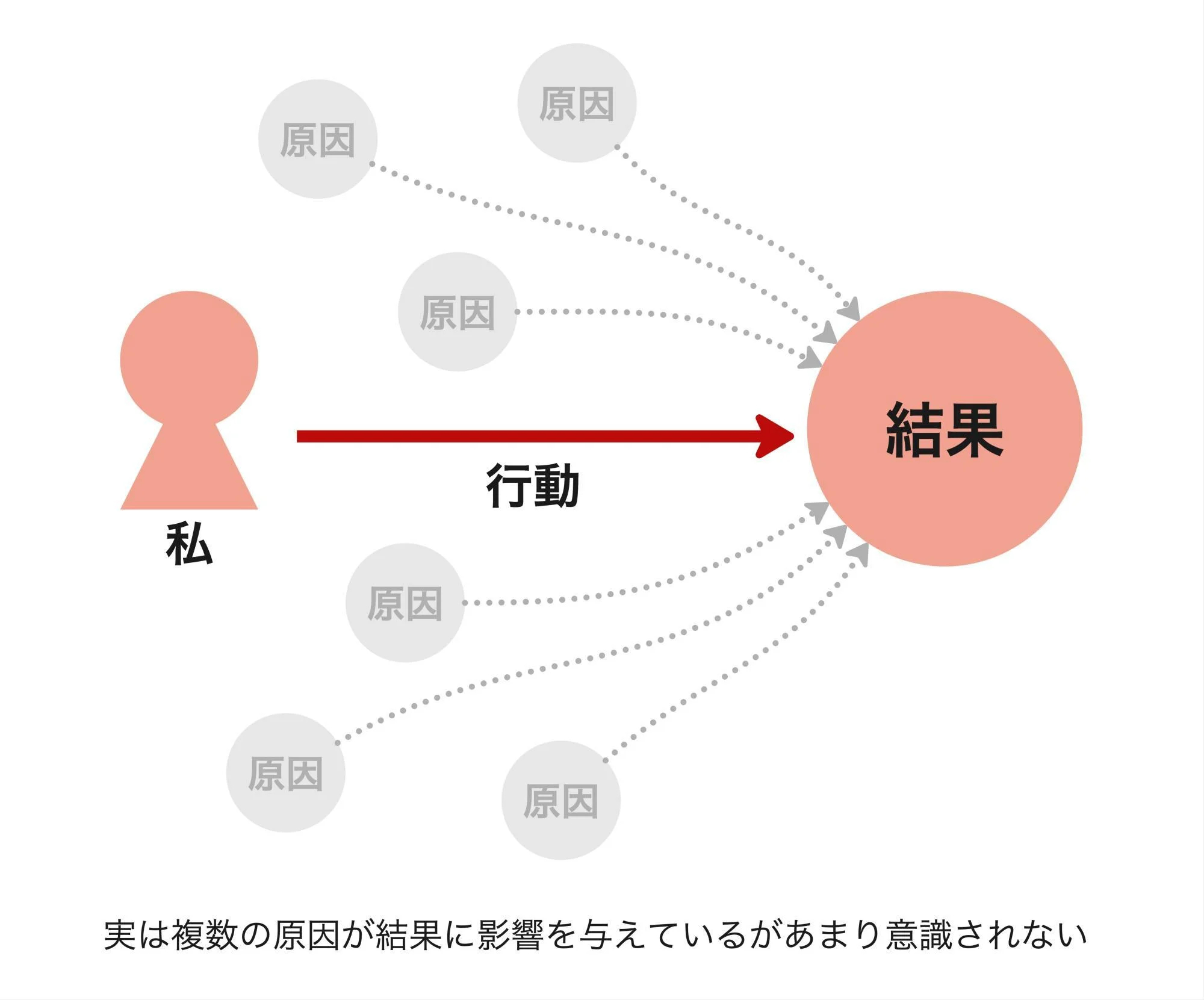 このプレイヤー的感覚の特徴は、自身の行動以外の原因に意識が向きづらい点です。自分が行ったことと結果が強く結びついているため、実は他の複数の原因も結果に影響を与えていることに気づきにくい傾向があります。