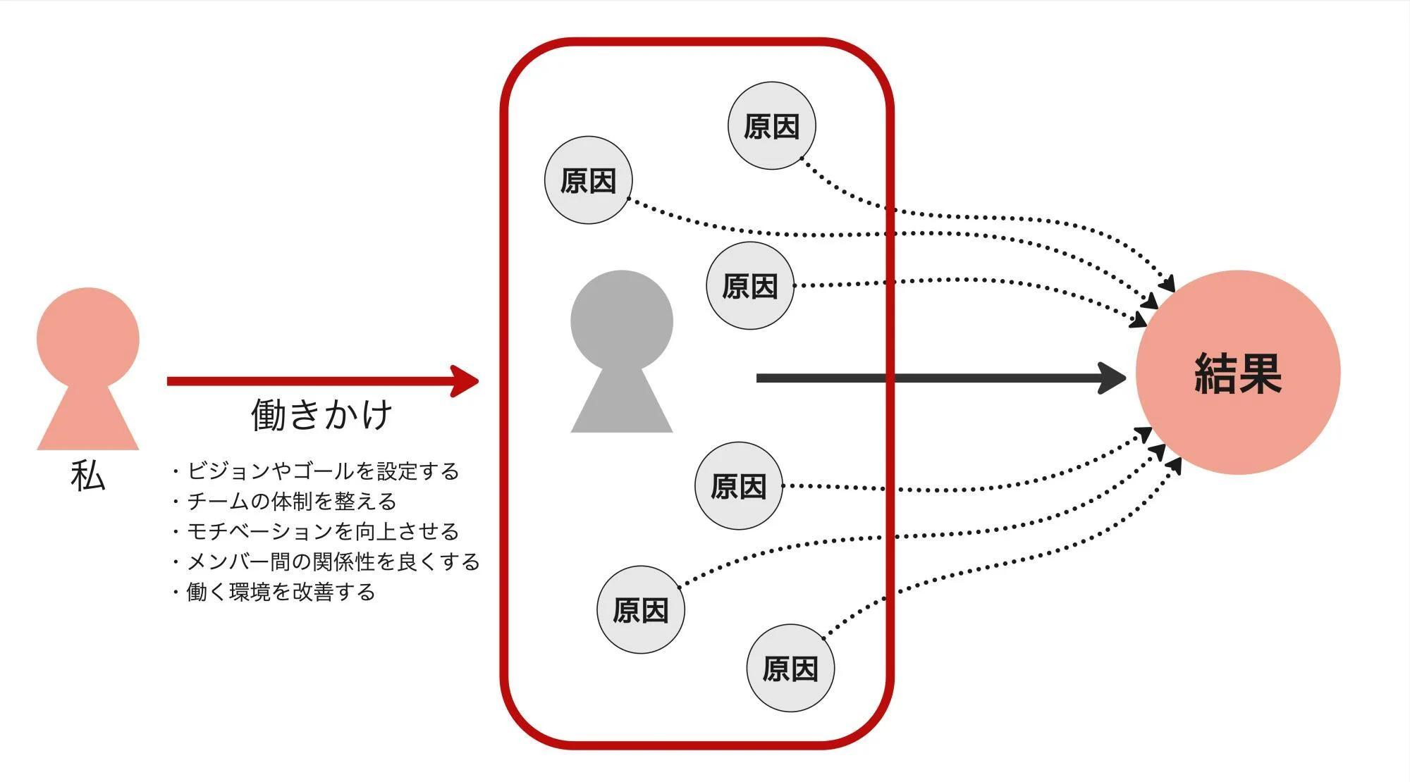 例えば、リーダーは以下のような働きかけを通じて、最終的に引き起こされる結果に影響を与えます。