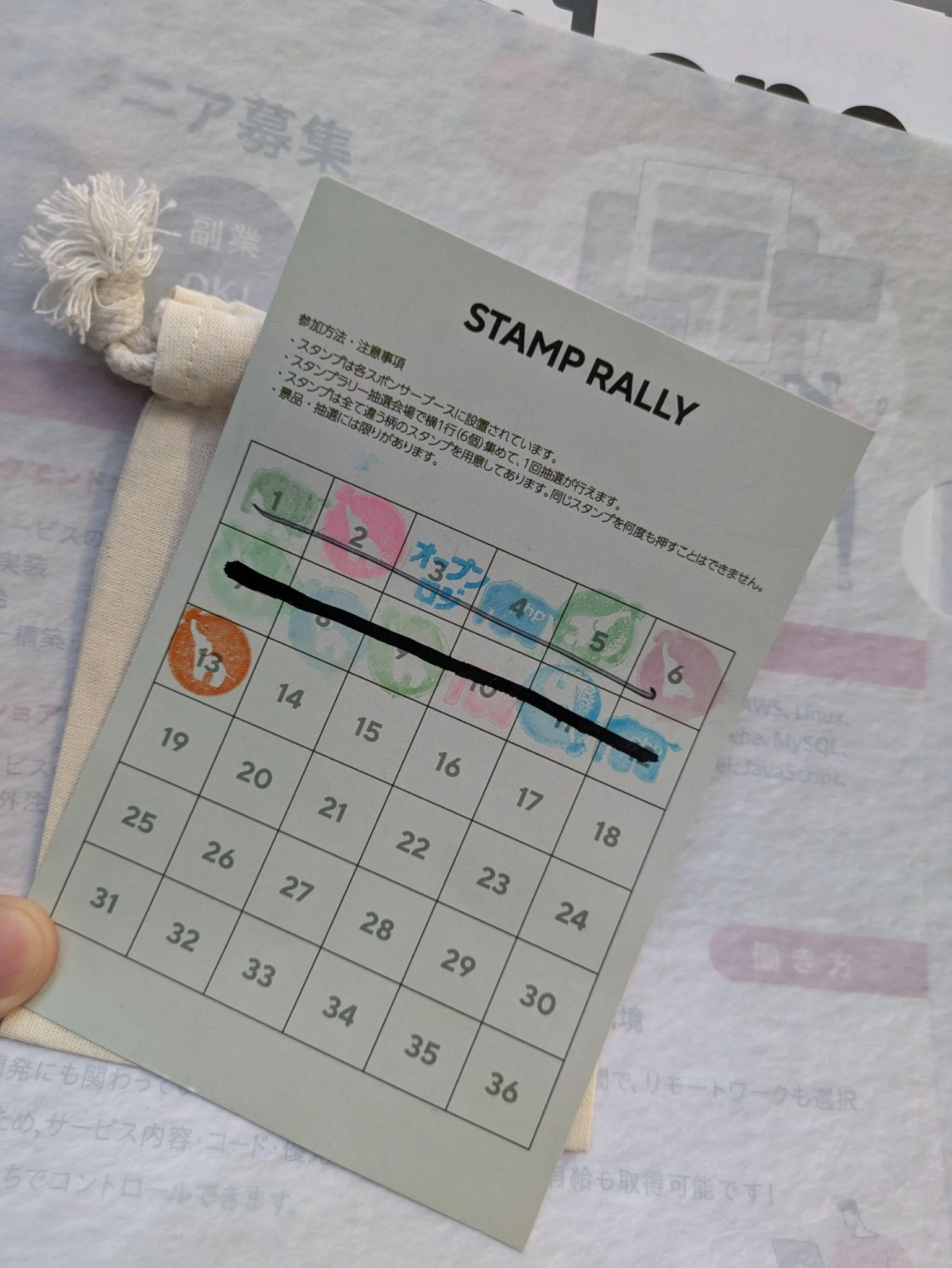 会場内協賛の企業がそれぞれブースを出しており、各アンケートに答えたりするとノベリティがもらえます。最初の入場の際もらう配布物にスタンプカードが入っており、スタンプ制覇一列毎に抽選ができ、当たると豪華賞品がもらえるような仕組みもあります。