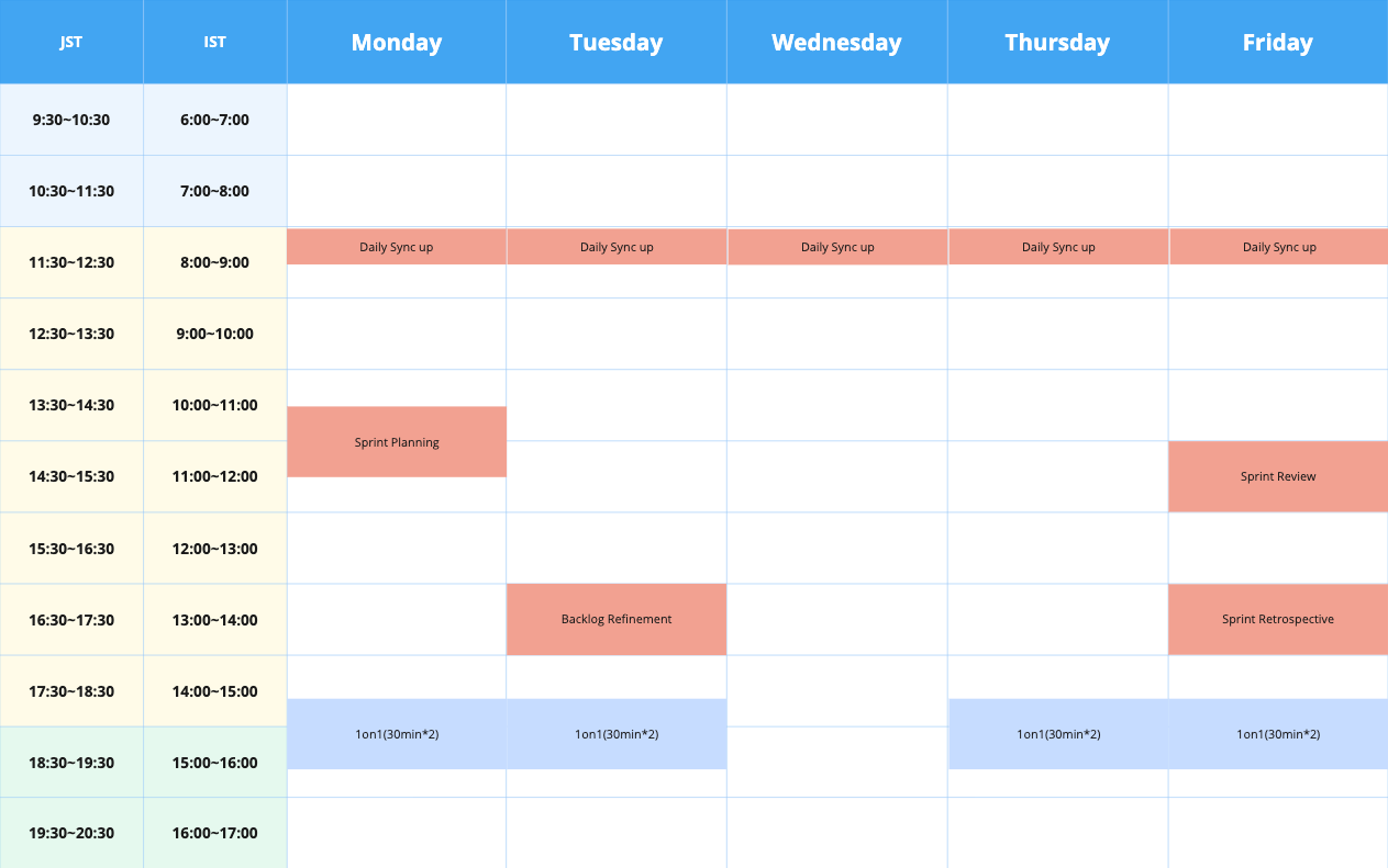 インドのメンバーが現地からの参加のため、現地の始業時間に合わせ、業務開始の確認もかねた形式のDaily Sync upを毎朝行いました。
