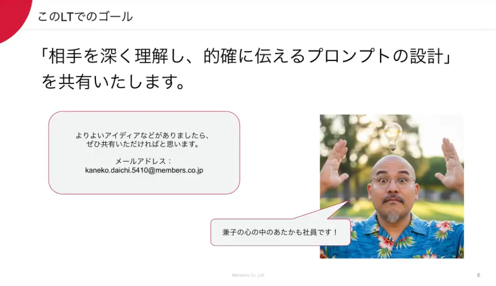 - ロール設定:経営層の立場を想定し、技術を「事業貢献」の言葉に変換。専門用語をできる限り排除。