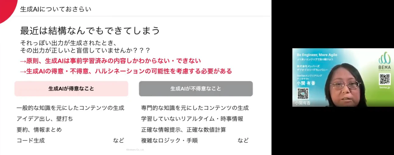 そんな小関さんがまず強調したのは、「生成AIは魔法のような万能ツールではない」という現実的な一言でした。