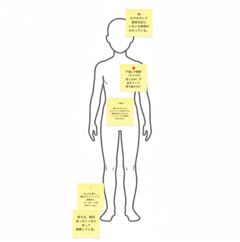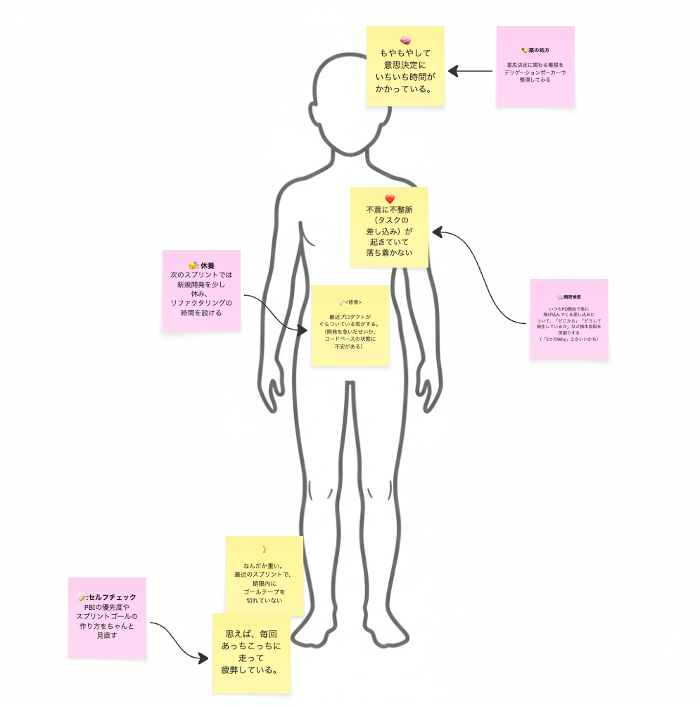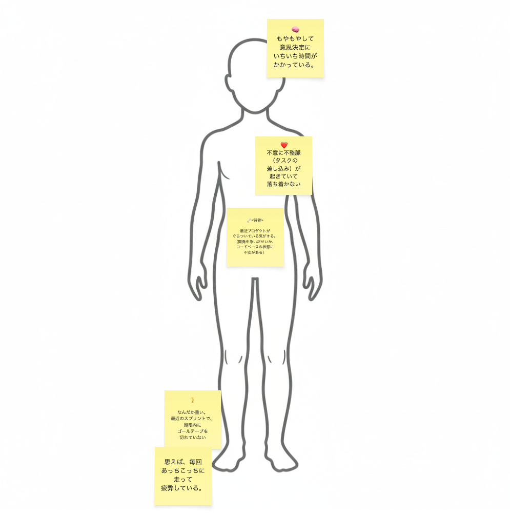 個々の問題(付箋)だけでなく、「人体全体」を俯瞰して「この人(チーム・プロダクト)はどんな状態か」を議論することで、個別の事象の裏にある、全体的・根本的な課題やパターンに気づきやすくなります。