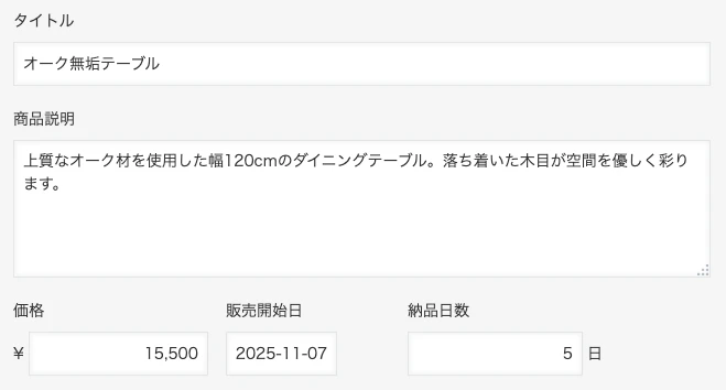 商品データの登録を想定して、以下のような項目を持つ画面を作成します。