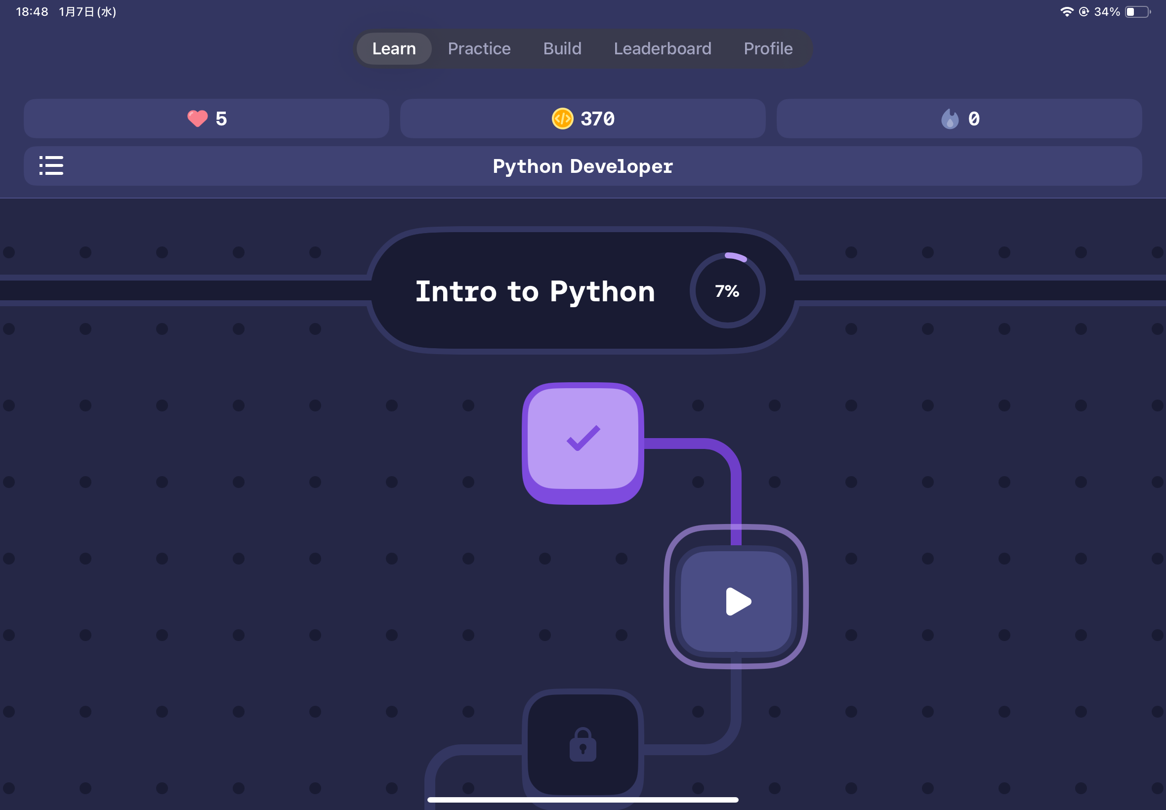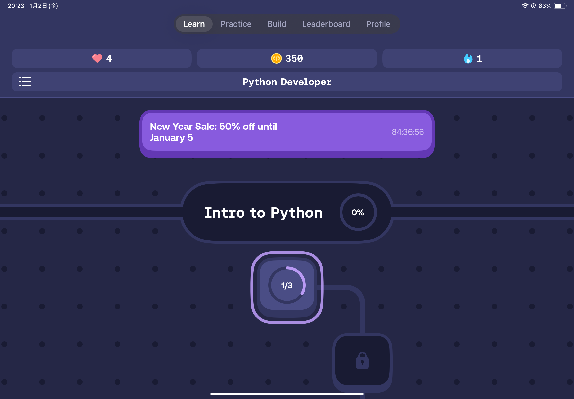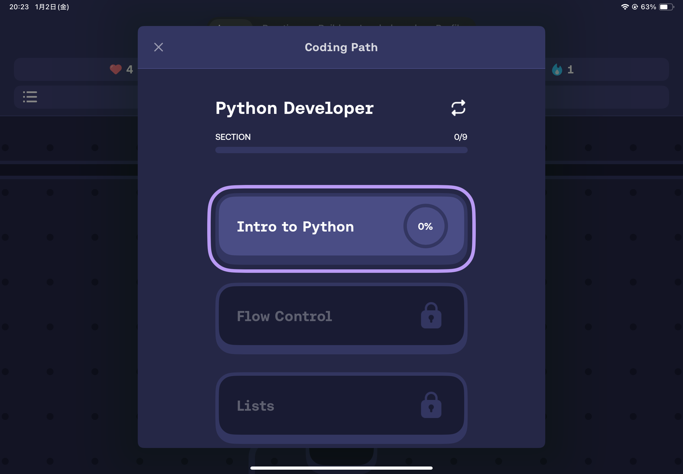 このような画面が出てきます!Pythonの中でも様々なコースがありますが、クリアしていくと解放されます!