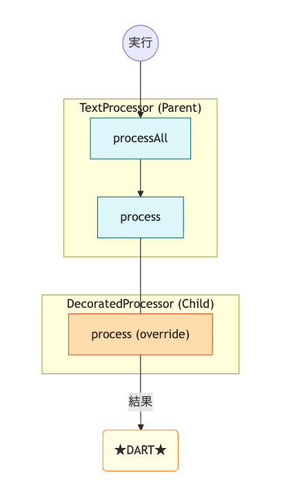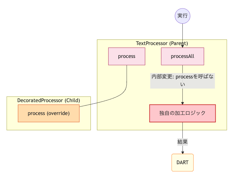 親クラスの processAll が内部で process を使うことは、単なる「実装の都合」であり、「公開された契約(約束)」ではありませんでした。