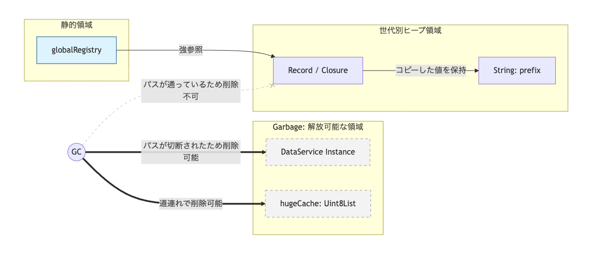 この「参照の鎖」は、DartのGC(ガベージコレクタ)がどれほど賢くても断ち切ることができません。なぜなら、globalRegistry が生きている限り、そこから辿れる this は「まだ必要なデータ」だと判断されるからです。