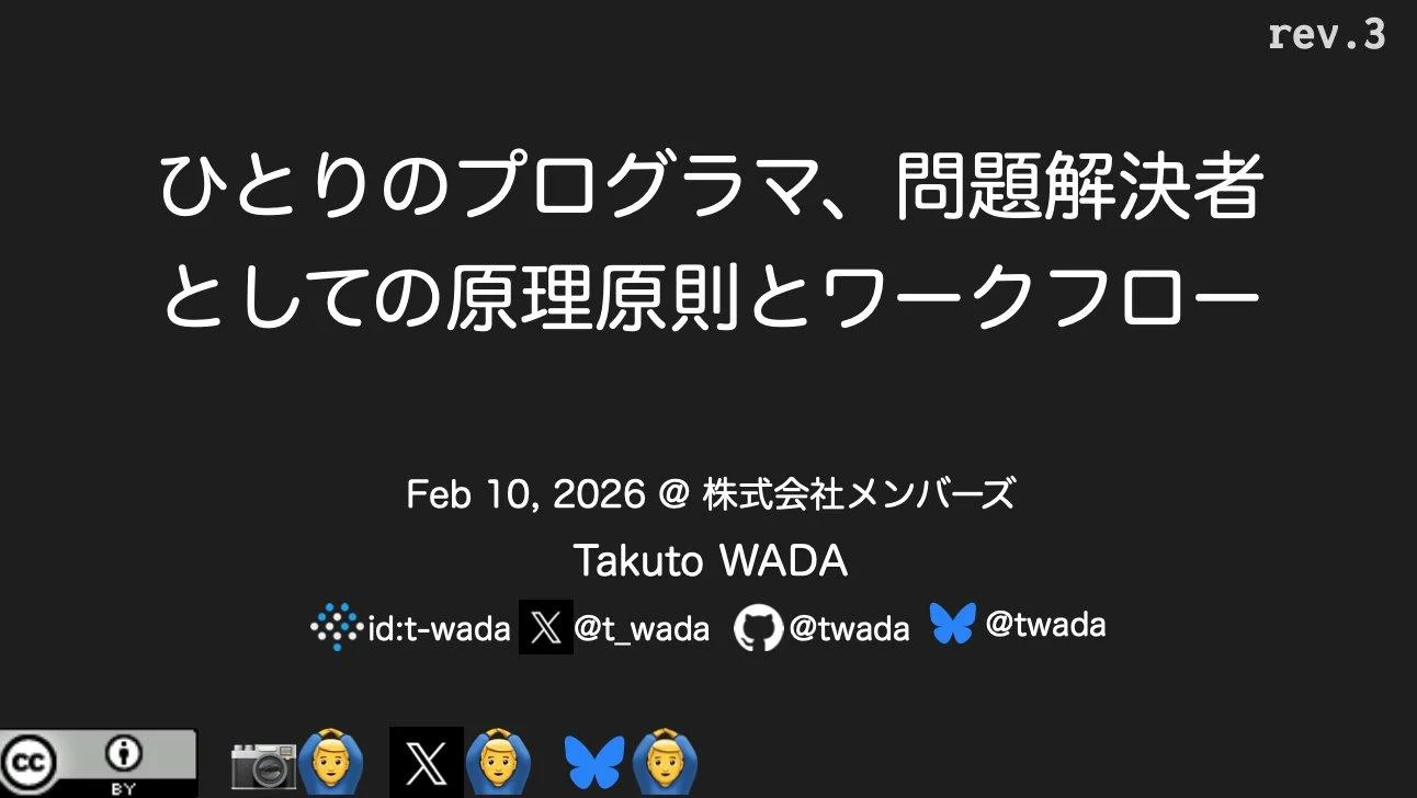 本イベントは、t-wadaさんが実際に参画された案件をベースに、プログラマ、そして「問題解決者」として大切にしている原理原則や、日々の開発ワークフローについてじっくりとお話しいただく貴重な機会となりました。