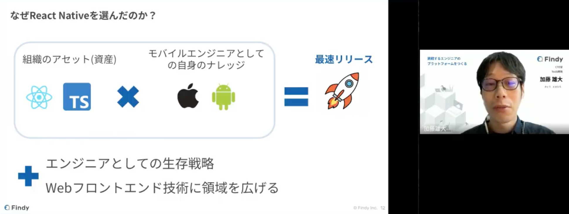 まず組織のメリットとしては、最速リリースです。これまでファインディ様で開発してきたプロダクトで蓄積されたReact・TypeScriptのナレッジと、加藤さんのモバイルエンジニアとしてのナレッジを掛け合わせることで、最速のリリースができます。