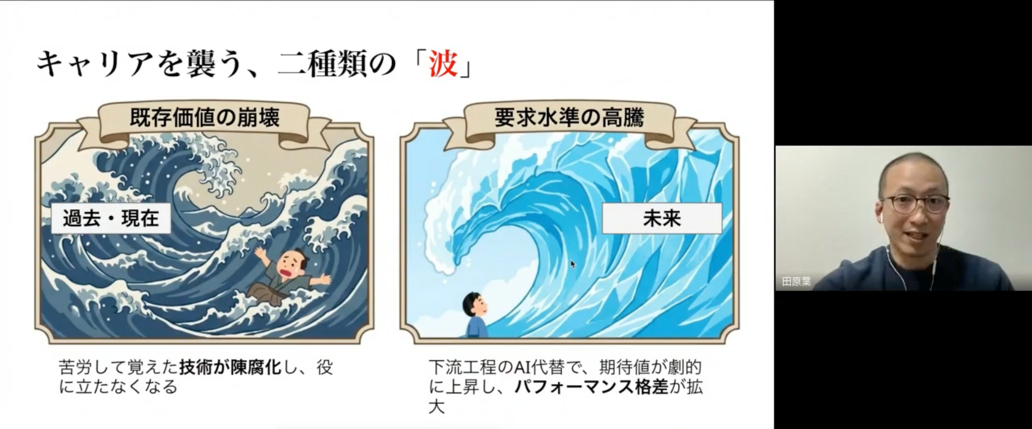 まず一つが既存価値の崩壊、もう一つが要求水準の高騰です。この波を乗りこなし、乗り越えていくためには船が必要です。田原さんはその船を会社に例えました。