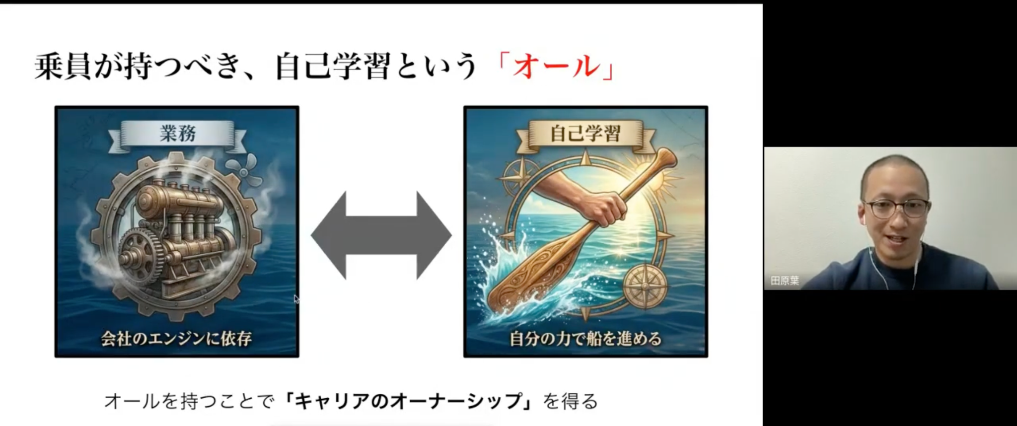 そこで、自己学習という「オール」を持つことで、自分のスキルを身につけ、会社の推進力(スキルアップ、会社の方向決定など)に加わることが重要と田原さんは考えています。