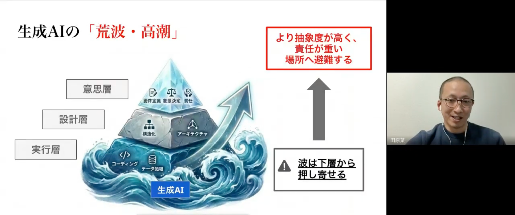 田原さんは、生成AIによって引き起こされる不確実性の波は、コーディングやデータ処理といった実行層から押し寄せるといいます。