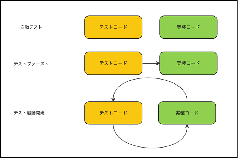 この3つの概念をテストコード、実装コードの作成タイミングの違いという観点でおおまかに図として表すと、次のようになります。