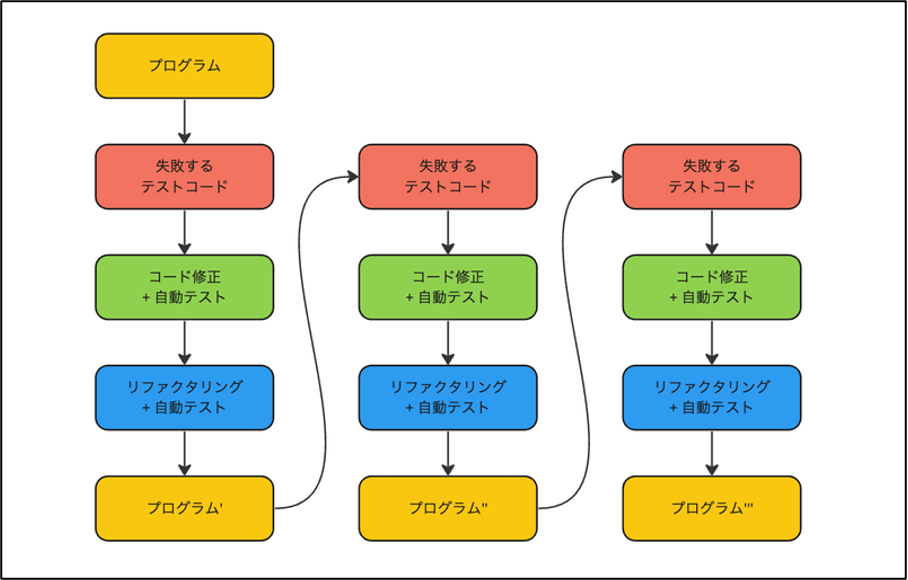 このテスト駆動開発では、次の3つのプロセス「レッド・グリーン・リファクタリング」を繰り返します。